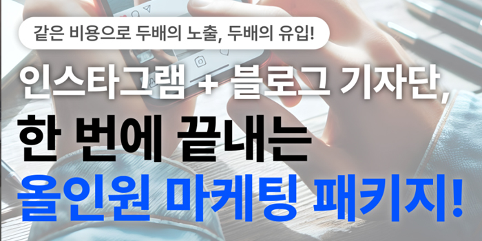 "아직도 주기적으로 피드만 채우는 업로드만 하고 계시나요?"계획적으로 진행해야 효과가 나타나는 게 인스타그램 마케팅입니다.같은 비용으로 두 배의 노출, 두 배의 유입!이제 하나의 채널만으로는 충분하지 않습니다.피앤엠 컴퍼니는 인스타그램 피드 업로드와네이버 블로그 기자단을 동시에 진행하는 통합 마케팅 상품을 선보입니다.단 한 번의 진행으로, 시각적 감성 +검색 노출 두 가지 효과를 한 번에 잡아보세요.※이런 분...